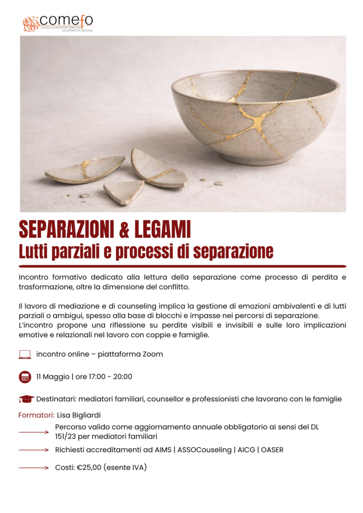 COMEFO è una società cooperativa che nasce dalla voglia di un gruppo di professionisti di diverse discipline di confrontarsi e condividere le esperienze da tempo maturate nel counselling, nella formazione, nella mediazione e nella progettazione di nuove forme di relazione di aiuto.